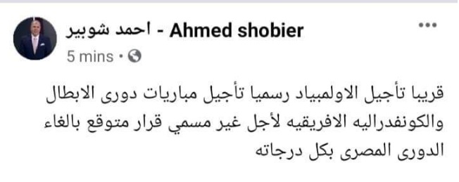كتب وأعلن كابتن شوبير عبر صفحته الرسمية بموقع التواصل الاجتماعي فيس بوك قرار متوقع بإلغاء الدوري المصري الممتاز بكل درجاته".