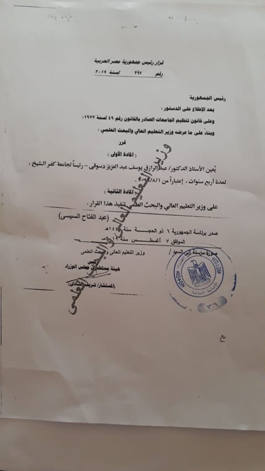 أعلنت وزارة التعليم العالي والبحث العلمي، مساء اليوم، صدور قرار جمهوري بتعيين الدكتور عبدالرازق يوسف عبدالعزيز دسوقي رئيسا لجامعة كفر الشيخ لمدة 4 سنوات اعتبارا من 1 أغسطس 2019م، خلفًا للدكتور ماجد القمري، الذي بلغ السن القانونية للمعاش.