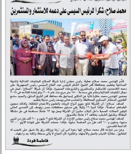 قدّم المهندس محمد صلاح عطية، رئيس مجلس إدارة شركة الصلاح للمنتجات الغذائية بالمدينة الصناعية ببلطيم، بمحافظة كفر الشيخ، الشكر للرئيس عبد الفتاح السيسى، رئيس الجمهورية، على دعمه اللامحدود للاستثمار والمستثمرين والمشروعات الصغيرة، مؤكدًا أن شركة "الصلاح"، تعمل فى مجال المنتجات الغذائية ومقام على مساحة 1800 متر مربع منذ عام 2008، وتم إعادة افتتاحه فى 2018 بحضور المهندس محمد حلاوة نائبًا عن الدكتور إسماعيل طه محافظ كفر الشيخ السابق، والعميد سامح الطنوبى المستشار العسكرى للمحافظة، والمحاسب هانى يوسف رئيس مدينة بلطيم.