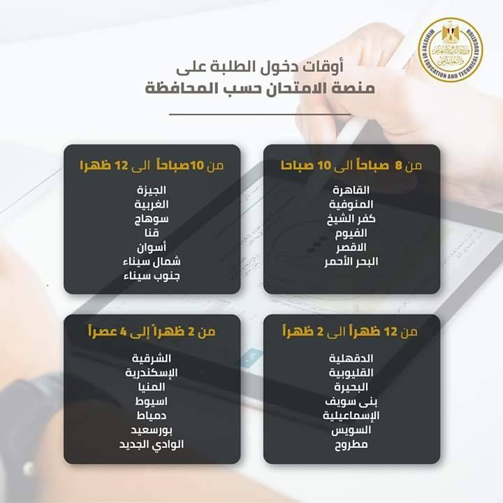 سيتم اتاحة الامتحانات للطلاب بمنازلهم وعلى التابلت في الفترة الزمنية من الساعة التاسعة صباحا وحتى الرابعة عصرا وفقا للجدول، مع العلم أنه يمكن أداء الامتحان من جهاز التابلت أو أي جهاز كمبيوتر أو محمول متصل بالإنترنت عن طريق الواي فاي أو الشريحة.