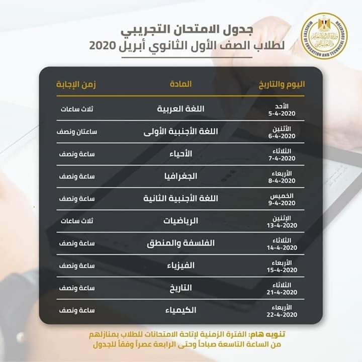 ثانيا : جدول الاختبارات التجريبية للصف الأول الثانوي من ٥ أبريل حتى ٢٢ أبريل ٢٠٢٠ والساعات المحددة لأداء الاختبار في كل محافظة