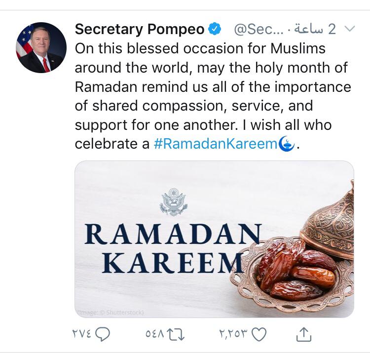 وقال بومبيو في تغريدته: " في هذه المناسبة المباركة على المسلمين في جميع أنحاء العالم، نتمنى أن يذكرنا شهر رمضان المبارك جميعًا بأهمية التعاطف وخدمة ودعم بعضنا البعض، أتمنى لجميع الذين يحتفلون رمضان كريما".