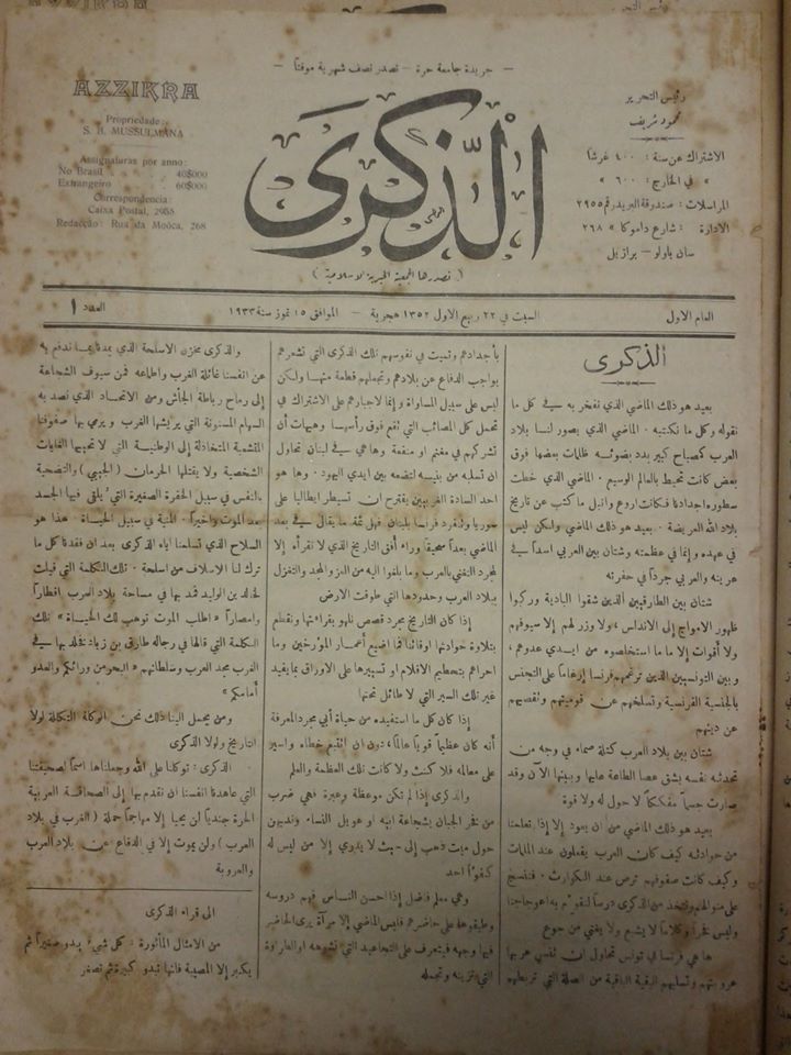 أما بالنسبة للصحف الإسلامية فقد صدر العدد الأول من "صحيفة الذكرى" في 15 تموز عام 1933م، عن الجمعية الخيرية الإسلامية في مدينة "ساو باولو"، وتوقفت عام 1941م بسبب قوانين النشر في البرازيل، ثم عادت عام 1958م تحت اسم "العروبة".