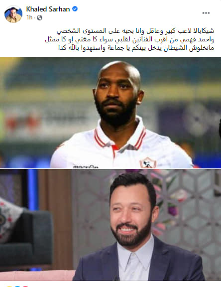 وكتب سرحان قائلاً " شيكابالا لاعب كبير وعاقل وأنا بحبه على المستوى الشخصي، وأحمد فهمي من أقرب الفنانين لقلبي سواء كـ مغني او كـ ممثل، ما تخلوش الشيطان يدخل بينكم يا جماعة واستهدوا بالله كدا"، وسرعان ما تدخل عدد كبير من متابعيه وجمهوره فى التعليقات لمطالبته بتغير الصورة وإضافة صورة الممثل أحمد فهمى بدلاً من المطرب أحمد فهمي.