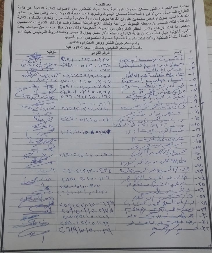 أرسل العشرات من أهالى المنطقة المجاورة لمحطة البحوث الزراعية بكفرالشيخ، بالعديد من الاستغاثات إلى وزير الداخلية، ووزير الزراعة، ومدير المحطة المركزية للبحوث، ومدير محطة البحوث الزراعية بسخا، بسبب وجود قاعة أفراح متآخمة لمنازلهم، ومواجهة لكلية الذكاء الاصطناعى بجامعة كفرالشيخ.