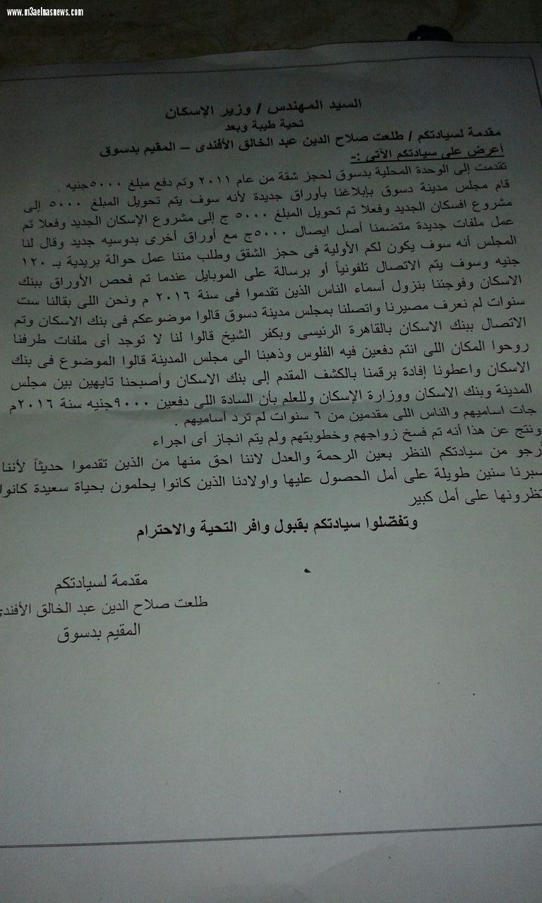 قال "الأفندى" فى استغاثته التى حصلت "مع الناس" على نسخة منها: "تقدمت بطلب للوحدة المحلية لمركز ومدينة دسوق عام ٢٠١١ للحصول علي وحدة سكنية ضمن المشروع القومي للإسكان"، مضيفًا، سددت مبلغ 5 آلاف جنيه كمقدم، كما تقدمت بكافة المستندات المطلوبة، وفي عام ٢٠١٦فوجئت بمنح من تقدموا وأحدث مني بالحصول علي شقق.