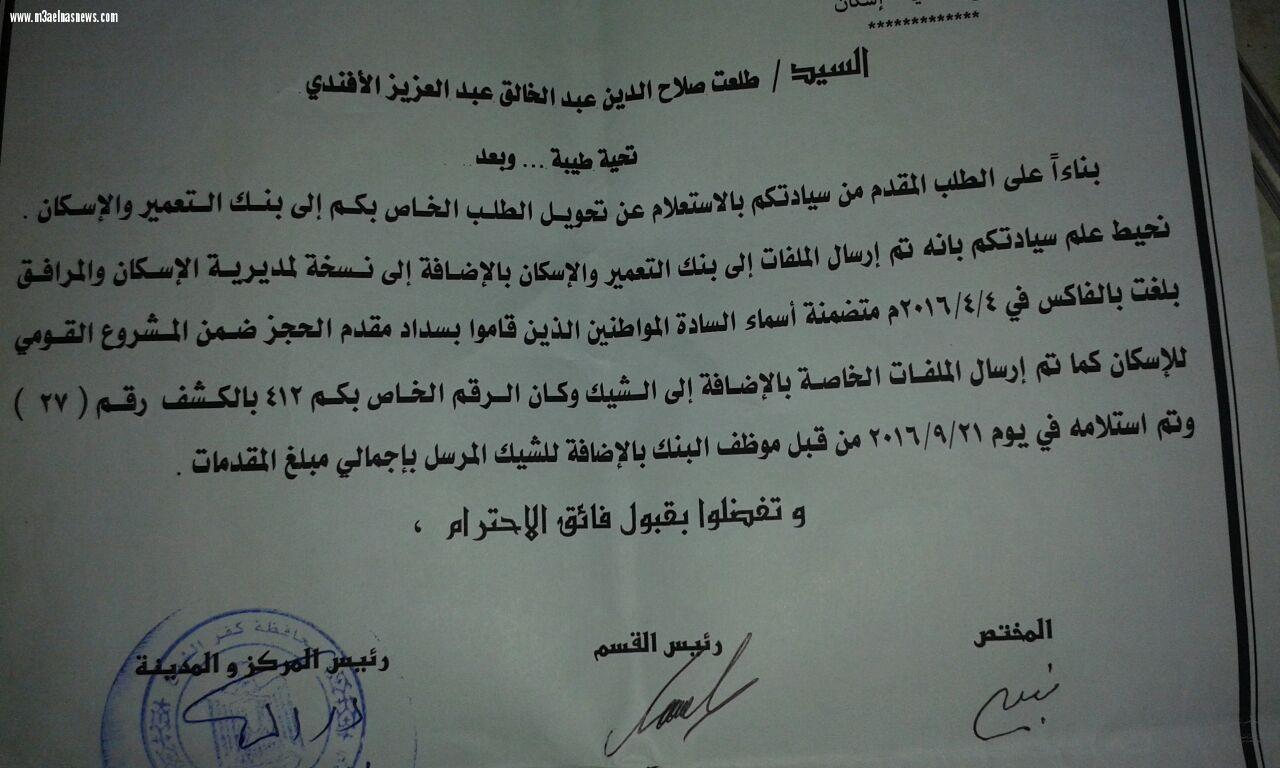 أوضح "الأفندى" ، "دوخت السبعة دوخات"، وأفادني مجلس مدينة دسوق بأن طلبي أُرسل ضمن آخرين، وقيمة الشيك تحت رقم ٤١٢، ومدون بالكشف تحت رقم ٢٧ وتم تسليم الملف لبنك الإسكان في ٢١ سبتمبر ٢٠١٦، ومنذ ذلك التاريخ، وأنا حائر لا أعرف لمن ألجأ لأحصل علي شقتي، وأنا في أمس الحاجة لتلك الشقة، لأنني متزوج حديثًا، وسيتم تشريد أسرتي، وأرجوكم "أغيثوني".