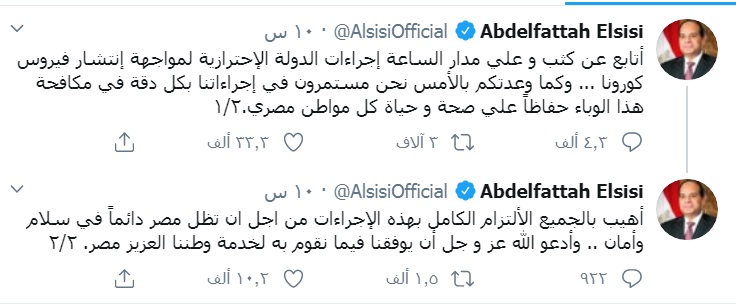 قال الرئيس السيسي، في حسابه على «تويتر»، مساء الاثنين:23-3-2020