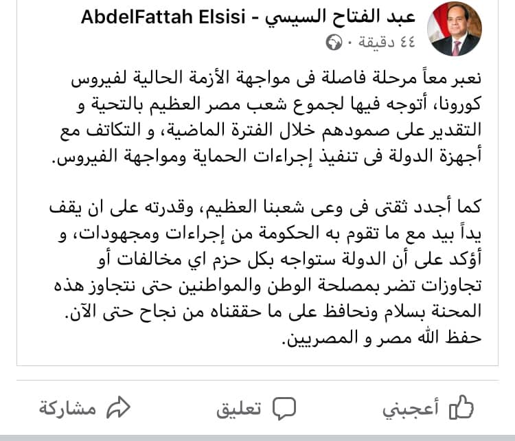 "نعبر معاً مرحلة فاصلة فى مواجهة الأزمة الحالية لفيروس كورونا" ، أتوجه فيها لجموع شعب مصر العظيم بالتحية و التقدير على صمودهم خلال الفترة