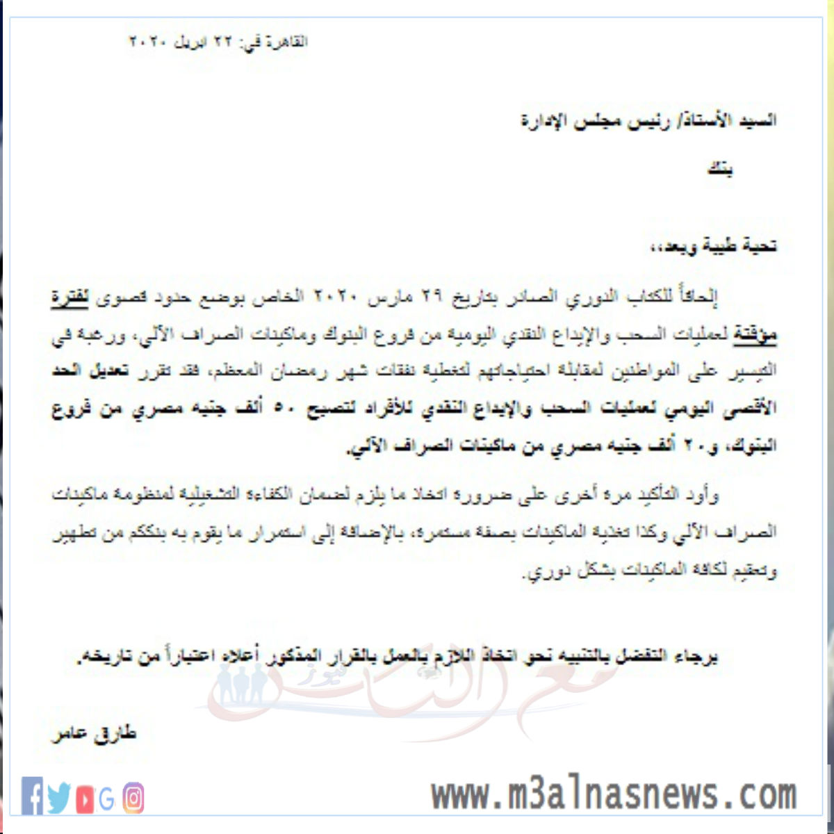 عبر ماكينات الـ ATM يوميًا بدلا من 5 آلاف جنيه فى الوقت الحالى، وترتفع فى الفروع من 10 آلاف جنيه يوميًا لتصبح 50 ألف جنيه.