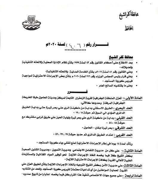 وشدد القرار على اتخاذ مديرية أمن كفر الشيخ، الإجراءات اللازمة نحو تطبيق قرار العزل لحماية أهالي القرية من أي تداعيات محتملة لفيروس كورونا المستجد، وللحد من انتشاره.